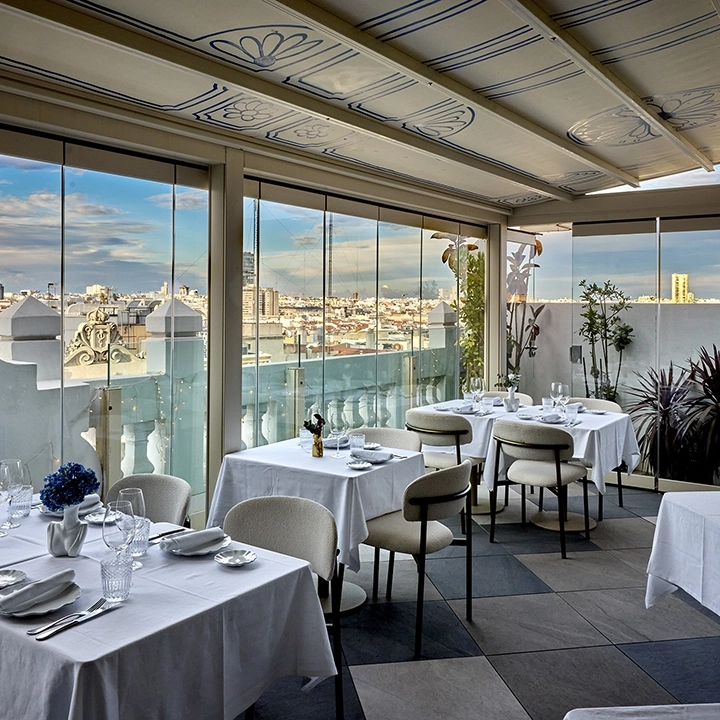 Luca Anastasio es el creador de cada uno de los cocktails a la altura de la octava planta de un edificio histórico en la Gran Vía. Desde el clásico Gin & Tonic a los signature como el ya mítico “On the way to Italy”. Idiomas, queridos.